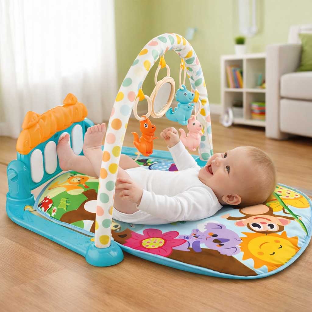 Ova šarena i mekana gimnastička podloga sa klavirom dizajnirana je da prati bebin razvoj od prvih dana.
