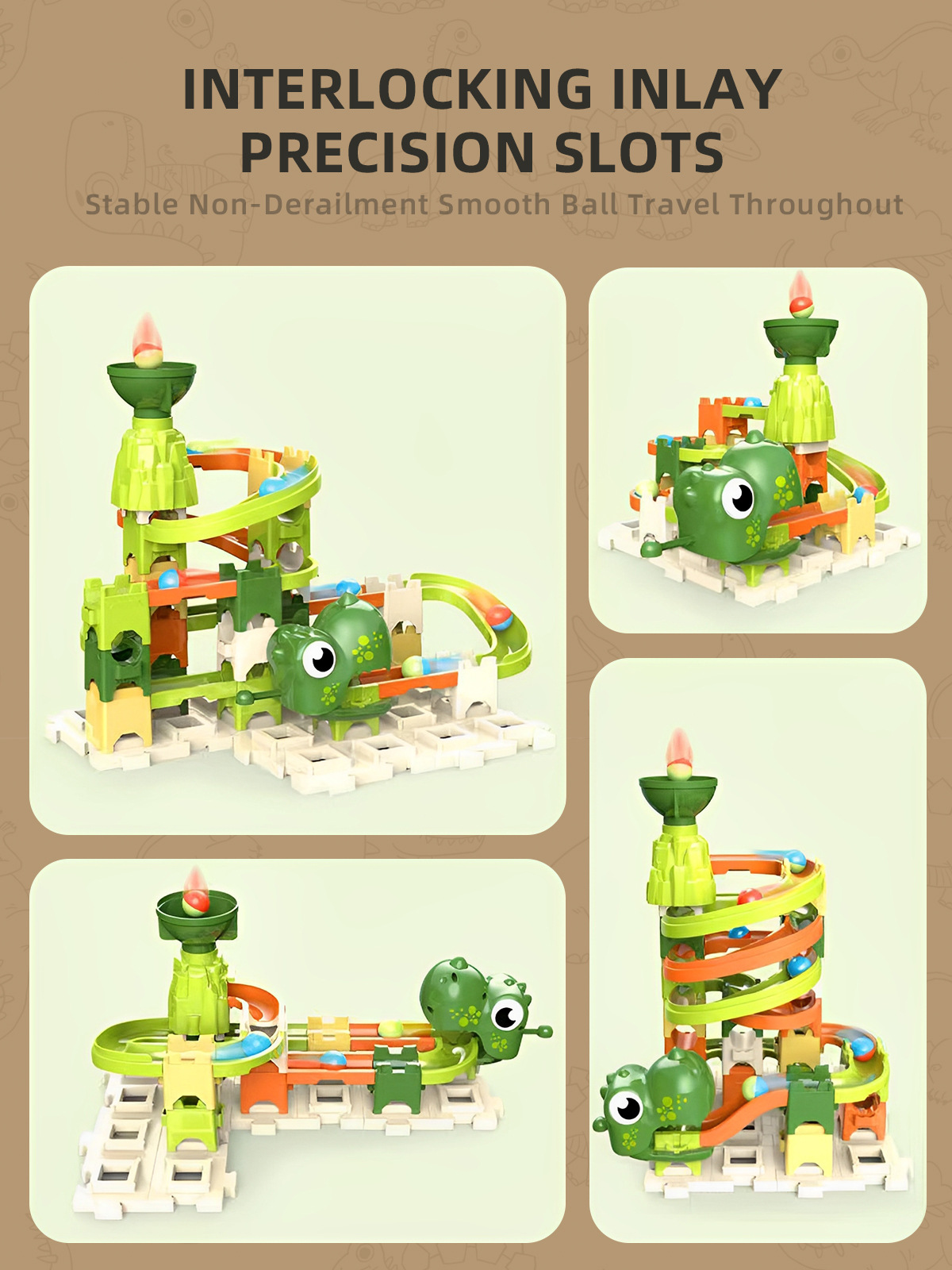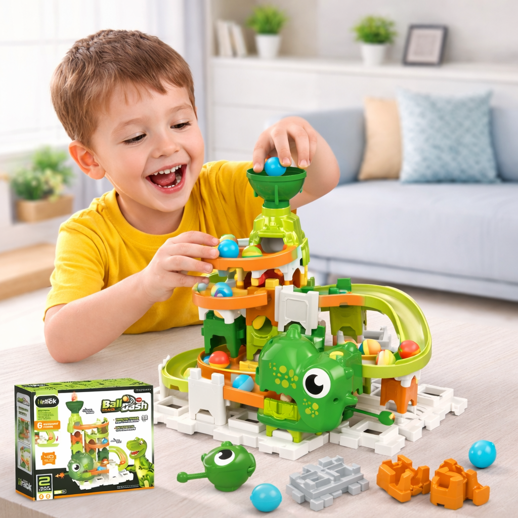 Ova DIY dinosaur staza sa lopticama (40 delova) omogućava deci da samostalno sastavljaju različite putanje i posmatraju kako se loptice kreću niz stazu. Igra podstiče logičko razmišljanje, koordinaciju i kreativnost.