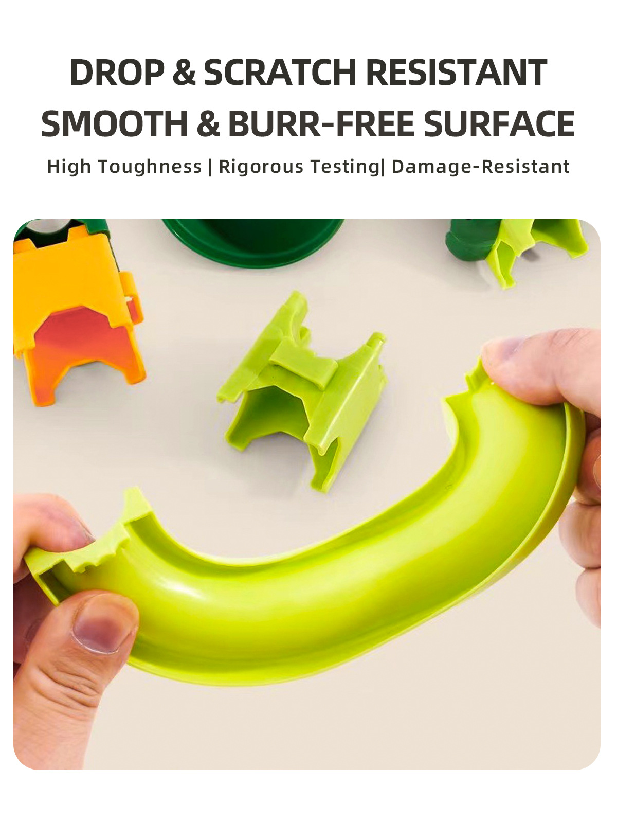 Napravljeno od kvalitetne plastike, sa zaobljenim ivicama, bez oštrih delova. Pogodno za decu 3+ godina.