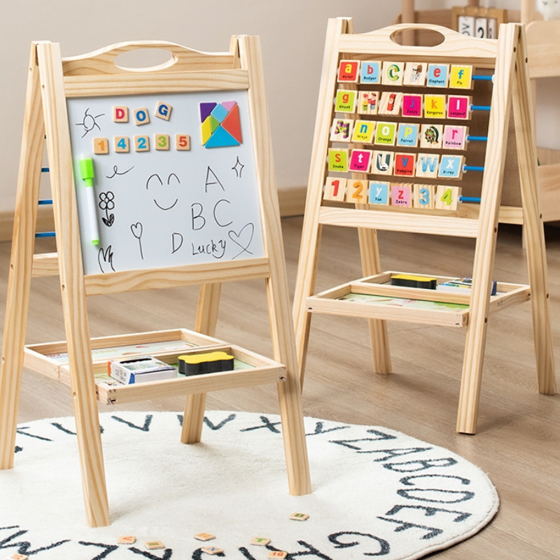 Ova drvena dvostrana edukativna tabla za decu dizajnirana je da kroz igru podstakne rano učenje, kreativnost i samostalno razmišljanje.