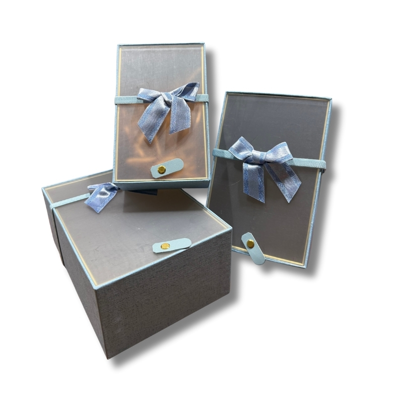 luksuzna pravougaona poklon kutija – set od 3 komada (bela ili plava)Luksuzna poklon kutija sa akrilnim poklopcem i mašnom – set od 3 komada (bela / plava)